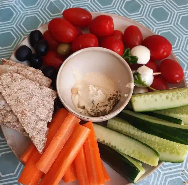 - Neem één bord en zet er in het midden een kommetje op. Dat vul je met de hummus of geitenkaas (gebruike eventueel meer naar wens).
