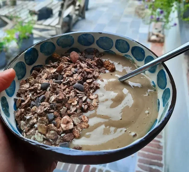 4. Giet/schep in een bowl en werk af met de granola en/of andere toppings naar wens.